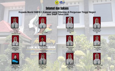 Kabar membanggakan datang dari SMK Negeri 1 Kalasan. Sebanyak 12 siswa terbaik berhasil lolos seleksi masuk Perguruan Tinggi Negeri (PTN) melalui jalu