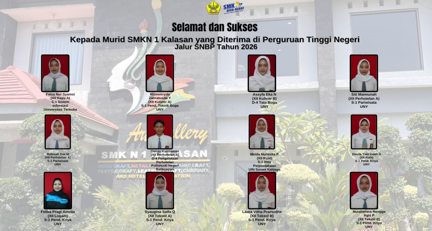 Kabar membanggakan datang dari SMK Negeri 1 Kalasan. Sebanyak 12 siswa terbaik berhasil lolos seleksi masuk Perguruan Tinggi Negeri (PTN) melalui jalur Seleksi Nasional Berdasarkan Prestasi (SNBP) tahun 2026. Prestasi ini menjadi bukti nyata kualitas pendidikan serta kerja keras siswa dalam meraih masa depan yang gemilang.